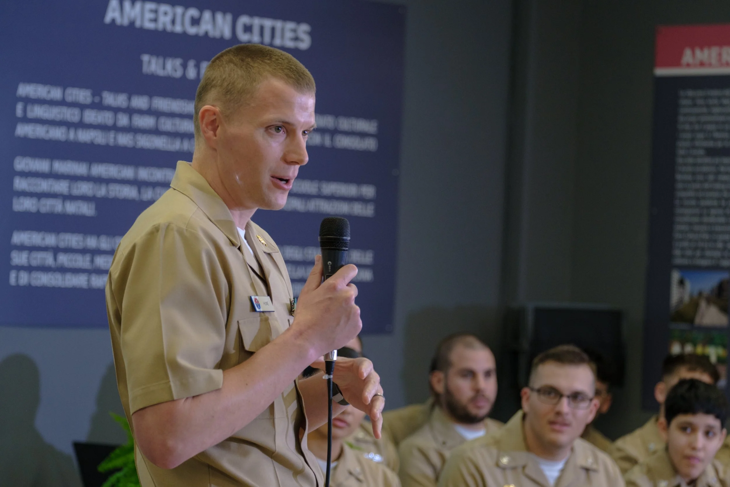 Giovani marinai Americani incontrano studenti di scuole superiori Italiane, per raccontare loro la storia, la cultura, le tradizioni e le principali attrazioni delle loro città natali.