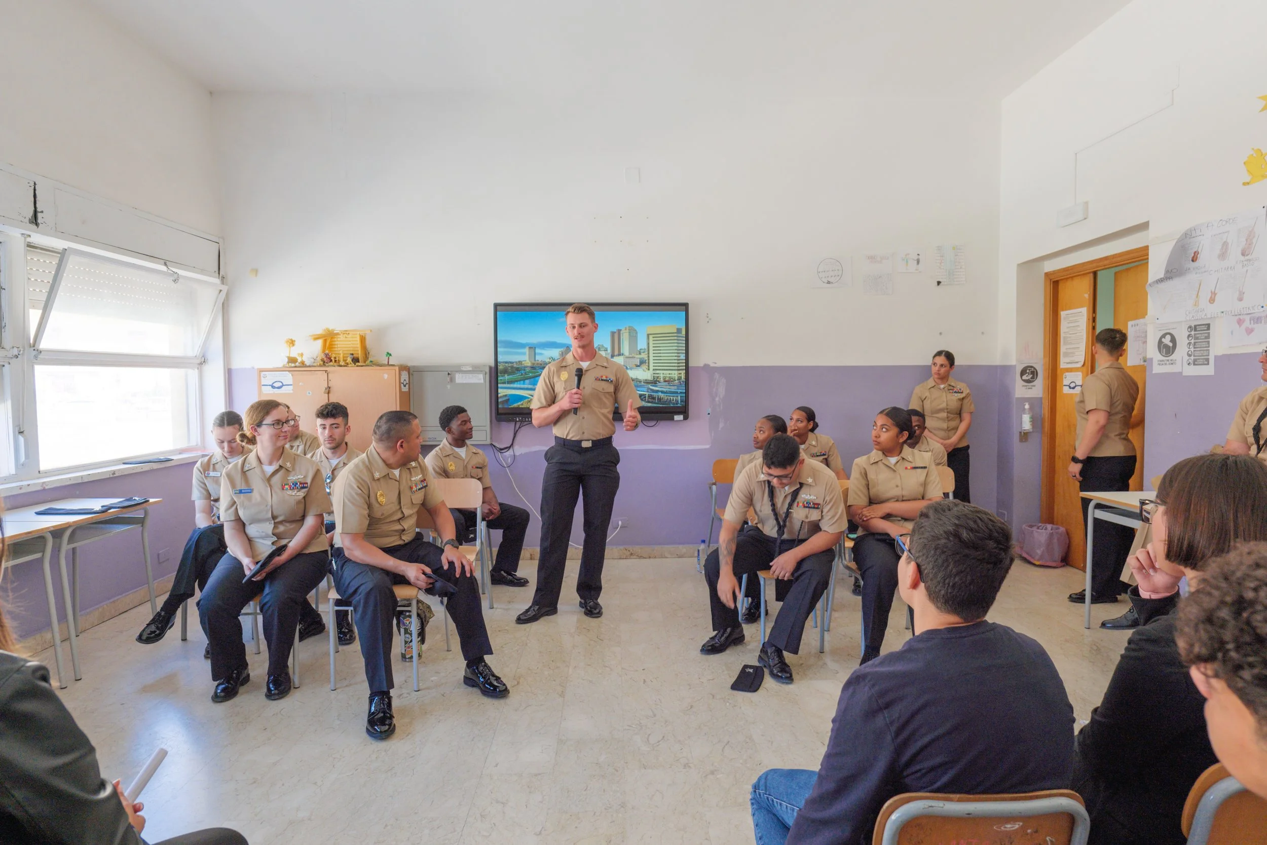 Young American sailors engage with Italian high-school students